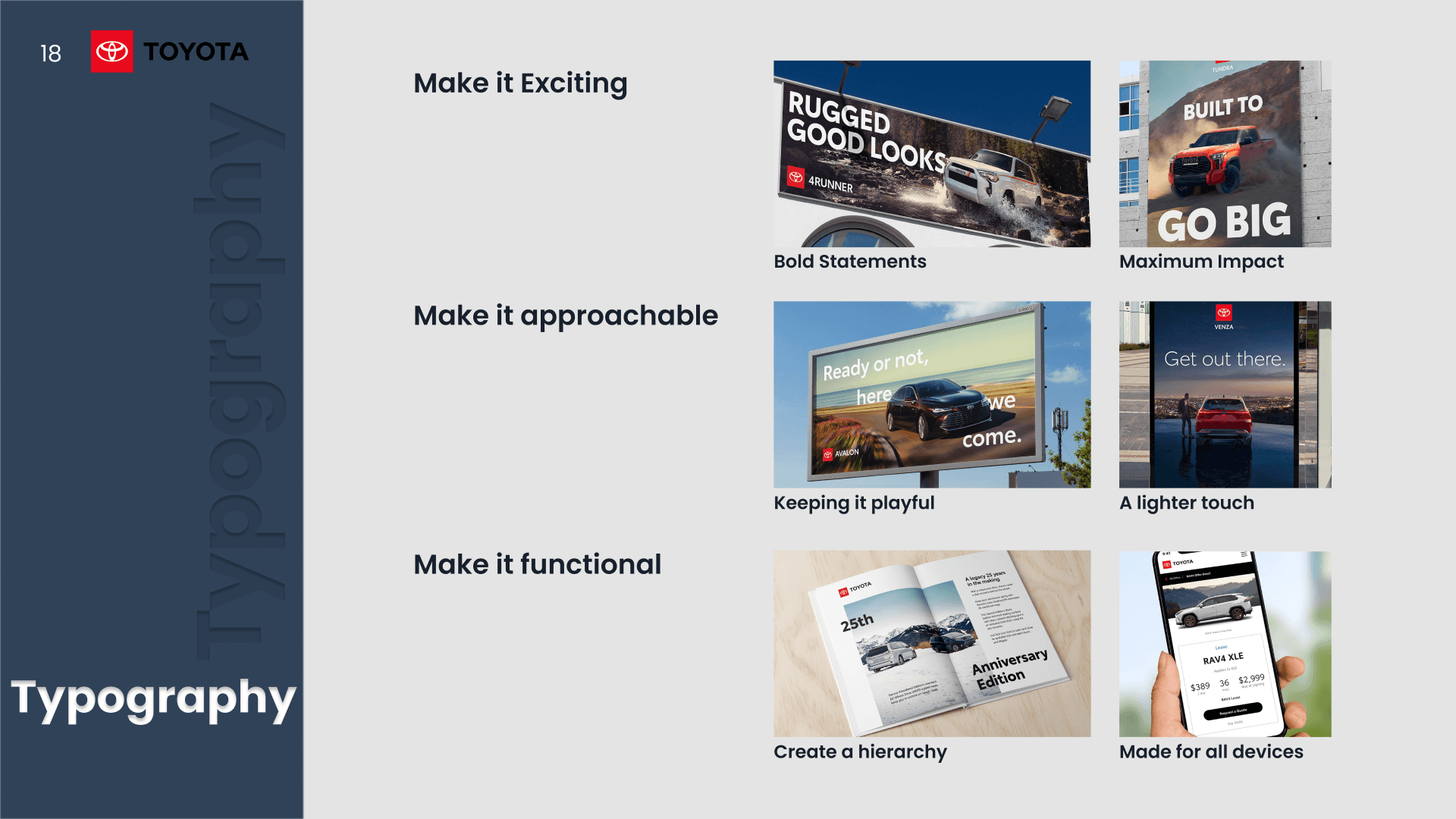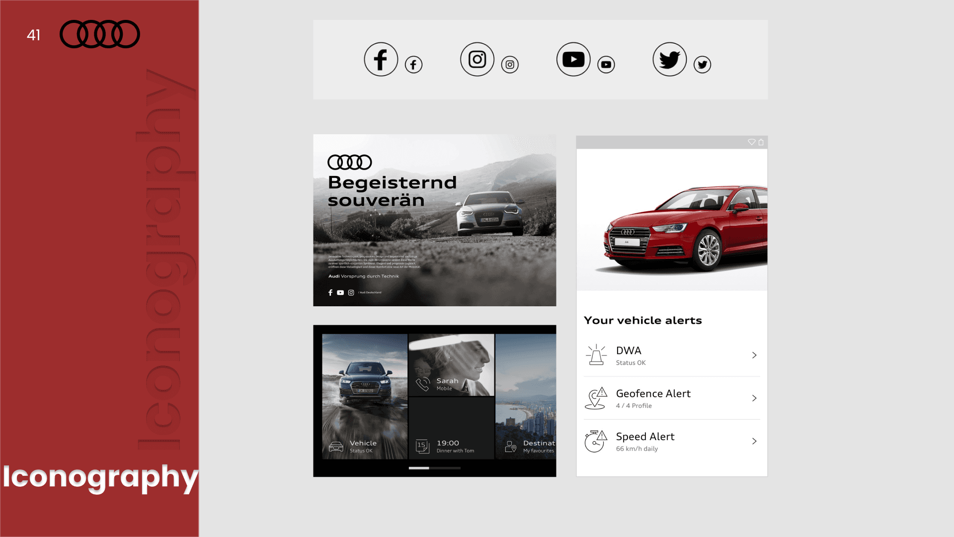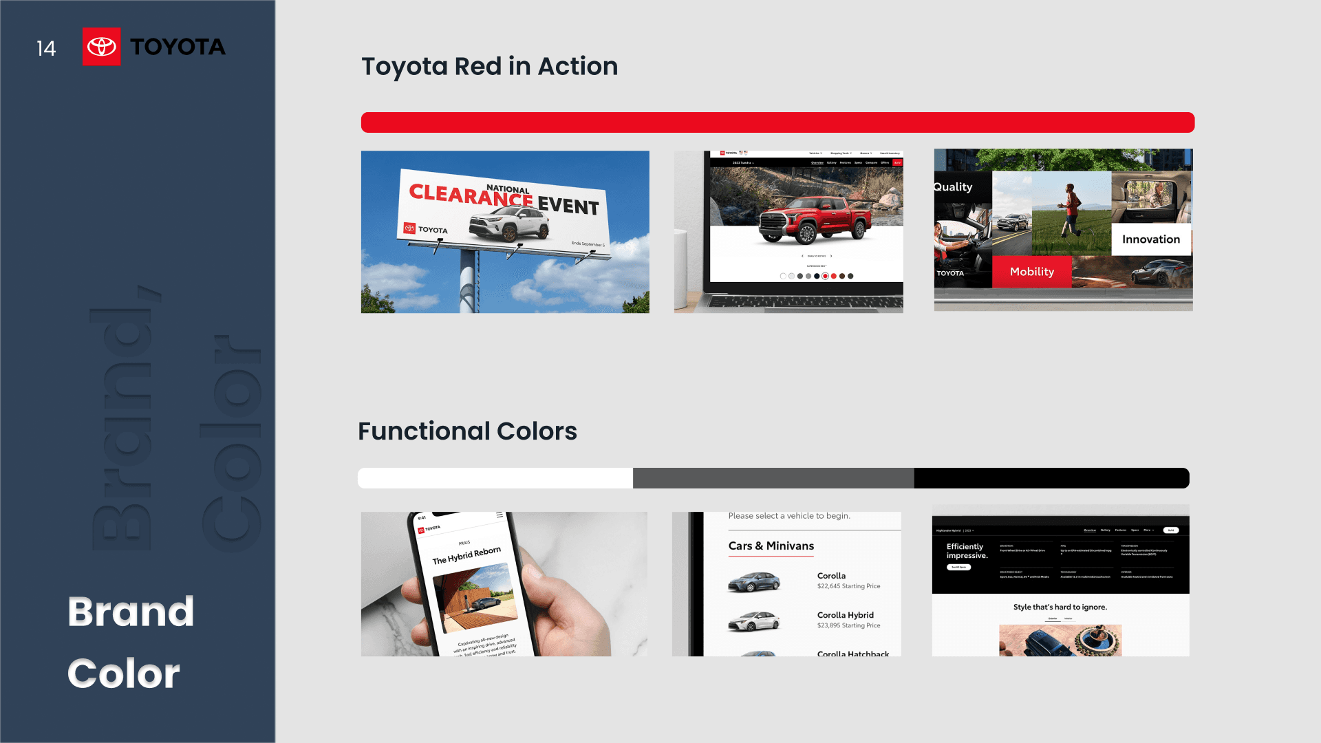 A presentation analyzing Toyota and Audi’s design systems through typography, color, layout, and visual hierarchy.
