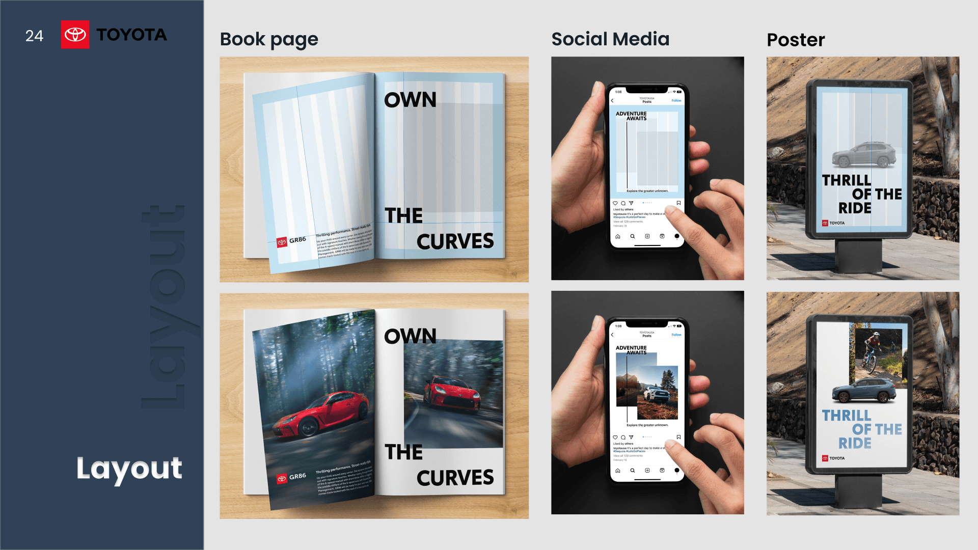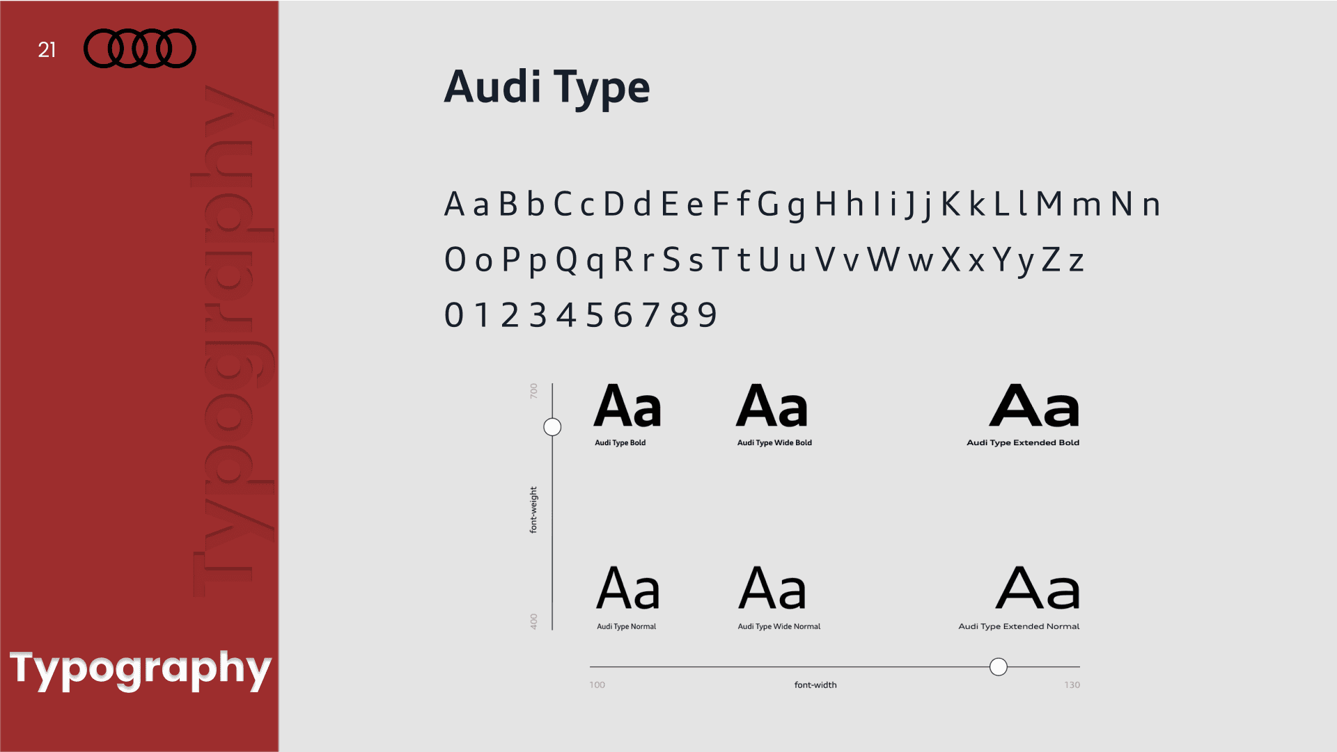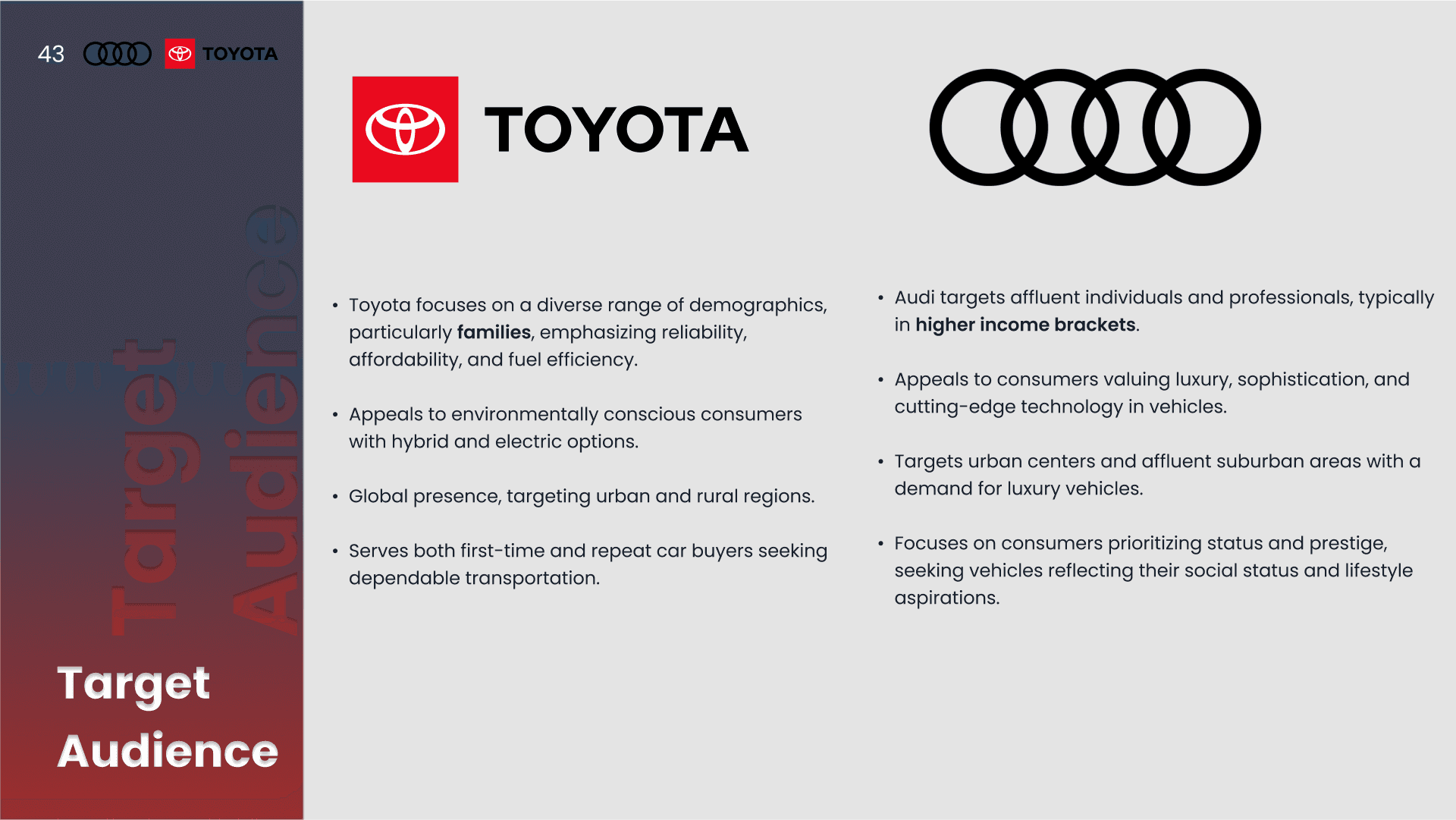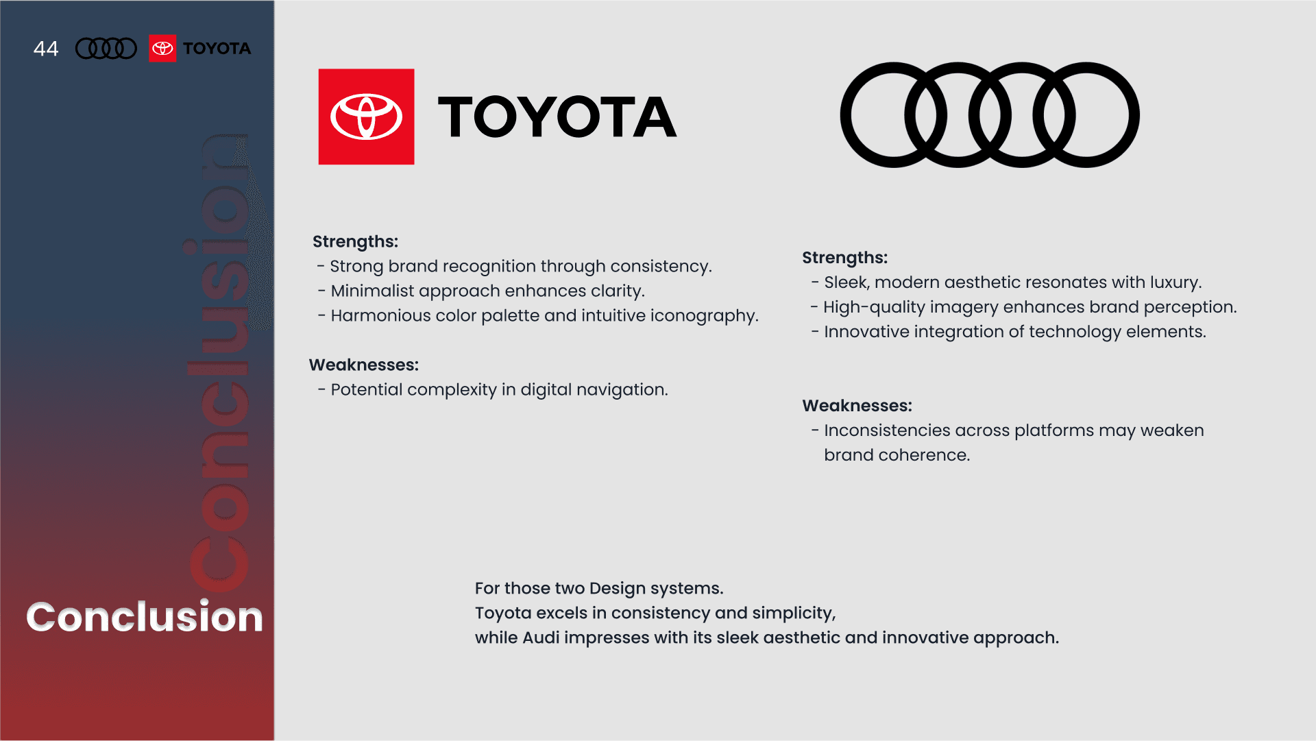 A presentation design project comparing the design systems of Toyota and Audi. The analysis explores typography, color systems, layout structure, and visual hierarchy to understand how each brand expresses identity and user experience through its visual language.